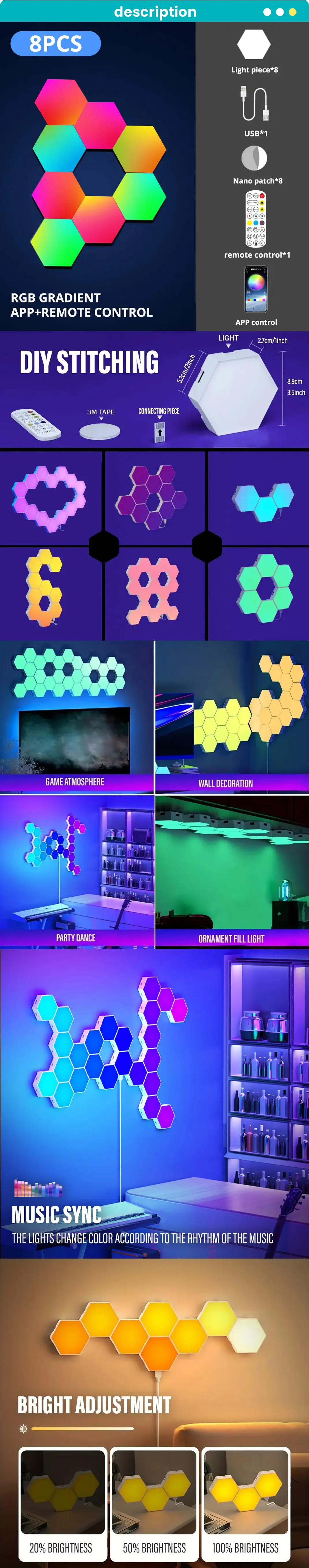 Applique Murale Hexagonale Intelligente RVB - 8 Piéces